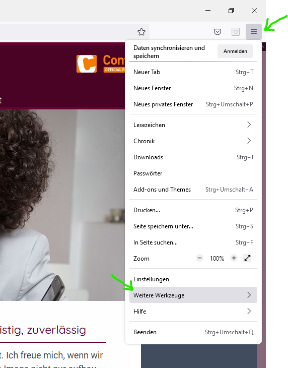 Klicke oben rechts auf das Hamburger-Menü (das mit den 3 Strichen, direkt unter dem Schließen-"X"). Im Submenü klicke auf "Weitere Werkzeuge" und dort im Submenü auf "Werkzeuge für Web-Entwickler"