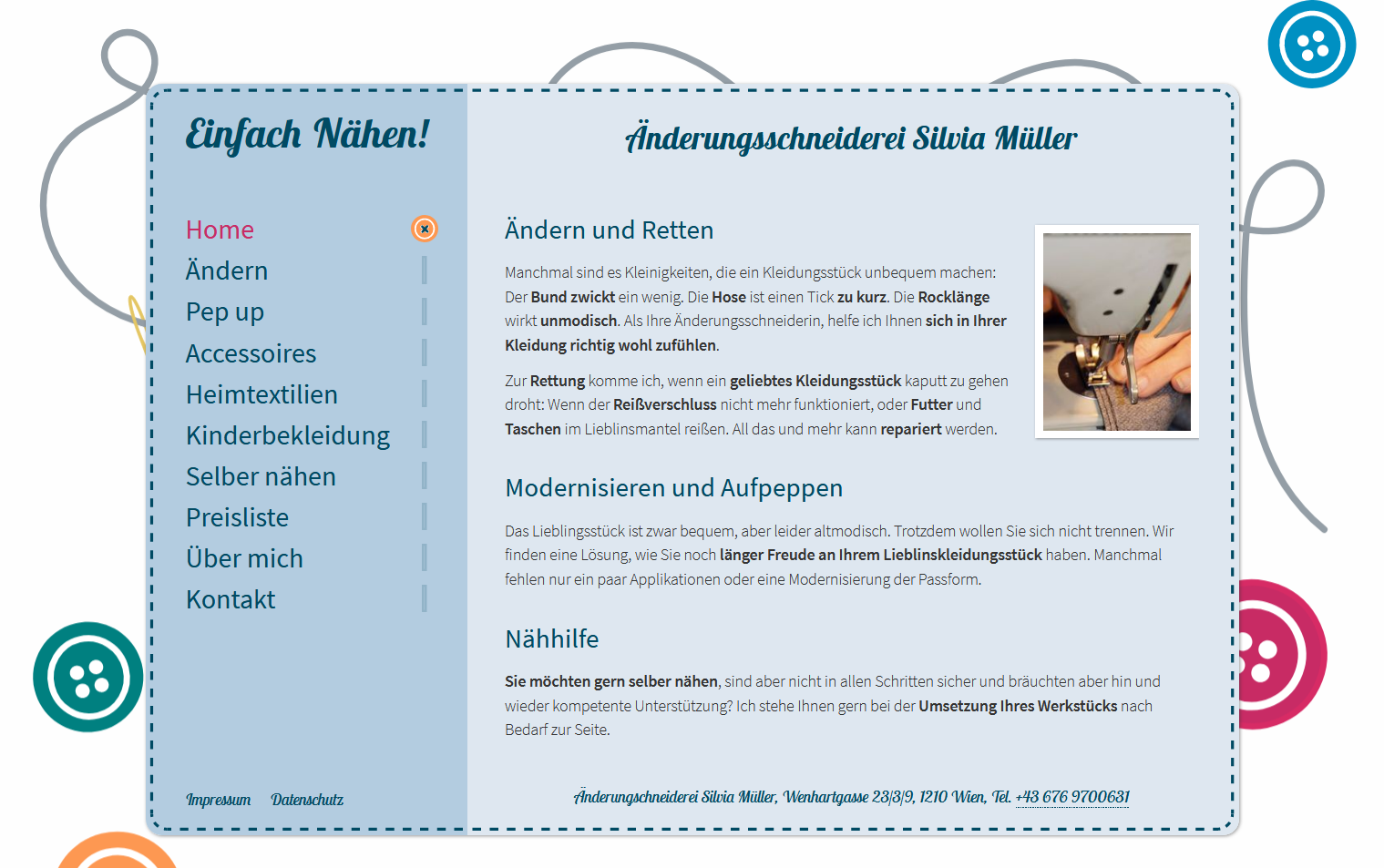 Silvia Müller ist eine lebenslustige Änderungsschneiderin im 21. Bezirk. Mit viel Kreativität rettet Sie das Lieblingsgewand ihrer KundInnen vor dem Aus. Ziel war es eine Website zu schaffen, die Silvias nette, entgegenkommende, sympathische Art wiederspiegelt und Ihr Angebot klar kommuniziert. Die neue übersichtliche Website, mit grafischen Elemente aus der Schneiderei, ist auch auf Smartphones leicht zu bedienen. Als kleine kreative Spielerei erhielt das Menü eine Knopflochleiste. Beim Überfahren der Menüpunkte spitzt der Knopf halb durch's Loch. Beim aktiven Menüpunkt wird eingeknöpft. Mit Contao kann Silvia ihre Website leicht warten. Gleich nach der ersten Einschulung hat sie losgelegt und ihre Bildergalerien selber ergänzt.