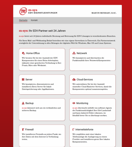 Manchmal muss es eben schnell gehen. Die alte Website von m-sys stand seit Jahren als größere Visitenkarte im Netz und war einfach nicht mehr modern. Da sie wegen eines interessanten Auftrags plötzlich wichtig wurde, schafften wir es innerhalb einer Woche einen Relauch im aufgepeppten Design hinzulegen und passende Vistenkarten fertig zu stellen. Schön war's im Kirschenmonat Juni mit der Farbe Rot zu arbeiten.